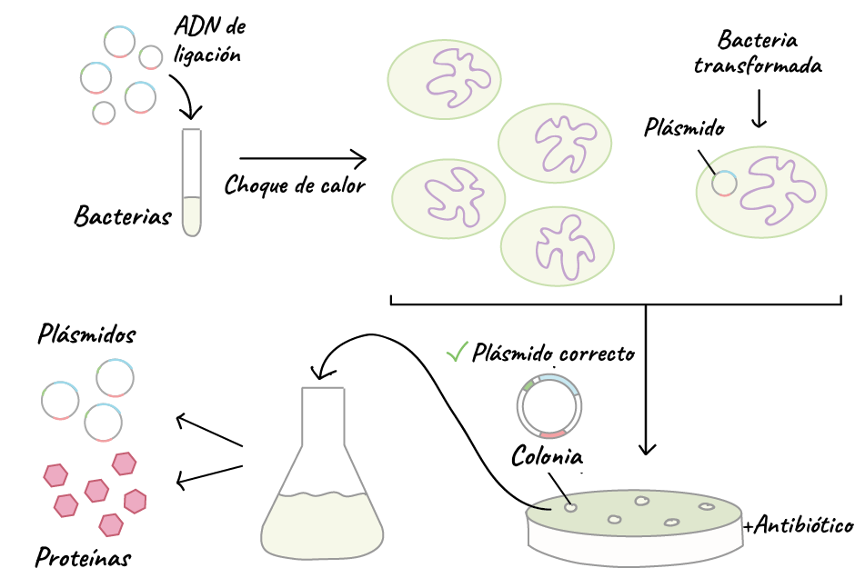 Transformación por el Método de choque termico. Imagen tomada de https://es.khanacademy.org/science/biology/biotech-dna-technology/dna-cloning-tutorial/a/bacterial-transformation-selection