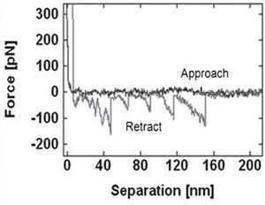 Typical sawtooth unfolding pattern of a single molecule of the HIV virion protein GP160. Unfolding forces can be extracted from the sawtooth pattern by applying the worm like chain model.