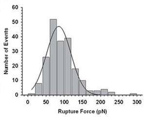 Sawtooth pattern on the retraction force curve indicating the unfolding of fibronectin. The average rupture force distribution of the protein on mica surface was 85.1 ± 2.7 pN. |