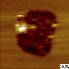 The images to the right show the self assembly of the HIV gp160 protein reconstituted into DOPC bilayer and adsorbed onto mica. Each pore is made up of 6 features with dimensions consistent with single molecules |