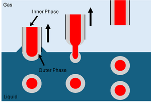 Single-axial interfacial shearing has been used to produce microdroplets[20] and double emulsions.[21] The process works by moving a needle periodically across an interface between gas and liquid and producing microdroplets when the liquid bridge is broken when leaving the interface.[20][21] Double emulsions can be formed similarly using a coaxial needle to cross a gas-liquid interface and producing dispersed microdroplets with two phases and the resulting droplets collect in a receiving pool of the liquid.[20][21] This is shown schematically in Figure 4.