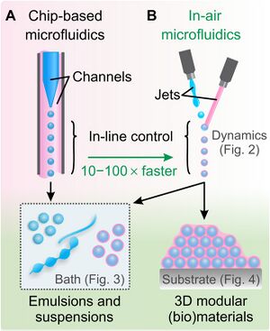 Free-jet FBM does not depend on the shear driving force but on the role of pressure and the ability of gravity to overcome capillary forces.[1] These jets are simpler to manipulate without an outer driving fluid.[1] Mechanical perturbations and external disturbances are used to influence the breakup of a jet.[1] One useful type of microfluidics which arise from this is in-air microfluidics which enables the in-flight formation of droplets, fibers, and particles.[10] An illustration of in-air microfluidics is shown in Figure 2. Other examples of free-jet FBM include architected micromaterials from in-air polymerization[11] and multifunctional janus microparticle makers using in-air microfluidics.[12]