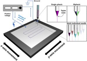 Electrospray is a key technique for producing monodisperse micro-nano droplets and capsules.[1] The typical coaxial electrospray system consists of a charged nozzle, a grounded electrode, an ink dispensing device, and DC power supply.[1] More complicated setups can leverage coaxial flow where, for example, two immiscible inks form an emulsified meniscus at the outlet of the nozzle which grows until gravity forces out the droplet.[1] The electrostatic force helps to accelerate this dripping into jetting which can be modified and controlled.[1] This concept has led to interesting EHD droplet and particle production including one example which involves the formation of a Taylor Cone and a resulting charged thin jet.[17]
