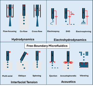 Microfluidics is a useful field for manipulating fluids and interfaces at the microscale. However, most of the designs are usually made in enclosed chambers. Free-Boundary Microfluidics (FBM) is an alternative to this approach and offers a similar way to manipulate fluids but using continuous droplets or jets in spacious open environments.[1] FBM is incredibly useful for its greater versatility over closed chamber microfluidics.[1] FBM is split into different groups based on the main mechanisms at play in the system being used.[1] These four groups are hydrodynamic, electrohydrodynamic, interfacial tension based systems, and acoustics based systems.[1] A qualitative description of these groups and some of the specific techniques which arise are shown in Figure 1. These types of free-boundary microfluidics are discussed in greater detail below.
