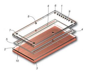A large-scale FFE device is a chamber with two insulating plates, typically glass or polymethyl methacrylate (PMMA), shown in Figure 3. The two insulating plates are separated by several hundred micrometers using a membrane spacer, typically cellulose nitrate, to create a separation chamber. The membrane spacer determines the FFE device height and has the ability to conduct and electrical current [3].