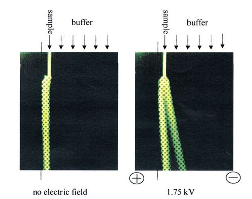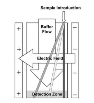 In regular capillary electrophoresis, particles are separated based on differences in electrophoretic mobilities in thin capillaries with the anode and cathode on opposite ends. Bands of particles will accumulate based on the electrophoretic mobility and can be analyzed in the same manner as FFE streams [2].