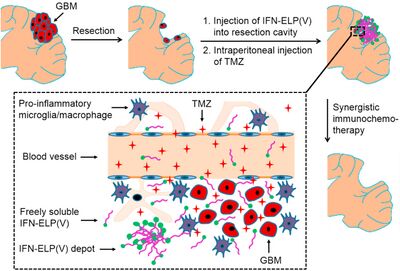 Ping Liang, Guihuai Wang, Xinyu Liu, Zhuoran Wang, Jing Wang, Weiping Gao. "Spatiotemporal combination of thermosensitive polypeptide fused interferon and temozolomide for post-surgical glioblastoma immunochemotherapy". Biomaterials 2021, 264, 120447