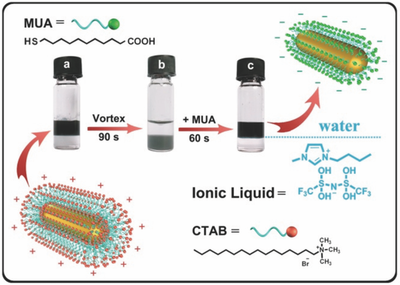 Linjia Su, Song Hu, Li Zhang, Zhuoran Wang, Weiping Gao, Jing Yuan, Minghua Liu. "A fast and efficient replacement of CTAB with MUA on the surface of gold nanorods assisted by a water-immiscible ionic liquid". Small, 2017, 13, 1602809.