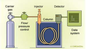 Gas chromatography can be broken down into a flow sheet diagram like in Figure 2. Gas chromatography uses a gas mobile phase and a liquid stationary phase for separation. The gas mobile phase is made up of a carrier gas, usually an inert gas like hydrogen, and the sample. The sample is injected into a vessel where it is turned into a gas through heat and is carried through the machine to the detector. Once the sample is ready, it is opened to the carrier gas and sent through the column with the help of pneumatic valves. Once the sample is carried into the column, it is allowed to interact with the stationary phase through different molecular interactions. The sample then is broken down into its components to be analyzed in the column. The analyzer instrument in the system detects the chemical properties of the sample and generates an electronic signal to be read. The electronic signal is then converted into a physical graph called a chromatogram for interpretation.[4]