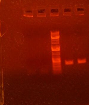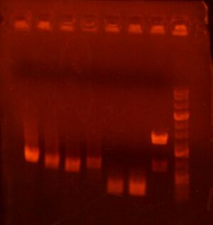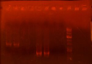 Lanes 3, 4, 7, and 8 showed no bands. These were under 300bp, and probably ran off the gel. ig129, 137, 201, and 207 will be digested again.