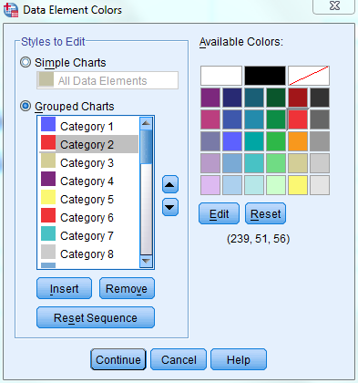 Launch SPSS, allowing the program several minutes to load. To open the excel file containing the data to be analyzed, navigate to File-> Open-> Data... A window will open prompting you to designate the path to your file. Navigate to the folder containing your file. By default, only .sav files will show up in the selection window. Change the file types displayed to "All Files" or "Excel" so that your excel file will be visible. Once it is, select the file and then click "Open". Another window will open asking you to designate the worksheet containing the data you would like to import. Select the worksheet labeled "SPSS_input" from the drop down window and click "OK". This will open your file in the SPSS data editor. Note that variable names and number formatting may be altered in the import process. To edit this formatting, navigate to the "Variable View" tab visible at the bottom left corner of the data editor. Although most of the formatting options are only for aesthetics, it is critical to check the "Measure" column to select the appropriate data type for each variable. Specifically, the "scaled_normalized" variable should be labeled as scale and the "coding" variable should be labeled as nominal. Further, you will need to specify the values for the coding variable. To do so, click on the cell in the same row as the coding variable and in the values column (should be labeled "None"). Then click on the button that appears in the cell labeled "..." to open the Value Labels window. In the window, enter your first value as 0 and enter the label as "Repression". Then click add. Now enter your second value as 1 and enter the label as "Activation. Click add again. Then select "OK" from the bottom of the window. Next, change the graph color coding options so that regulatory weights indicated as 0/Repression will be labeled blue and weights indicated as 1/Activation will be labeled red as in GRNsight. To do so, navigate to "Edit"-> "Options...". In the Options window, select the Charts tab from the top right and then click on the "Colors..." button. Select the "Grouped Charts" option within the "Styles to Edit" box. Then click on "Category 1" and select the blue color from the "Available Colors" menu to the right. Now click on "Category 2" and select the red color from the "Available Colors" menu. Once you have done so, your window should look like the sample provided below. If it does, click "Continue" and then "Apply" in the original Options menu. Now click "OK" to return to the data editor.