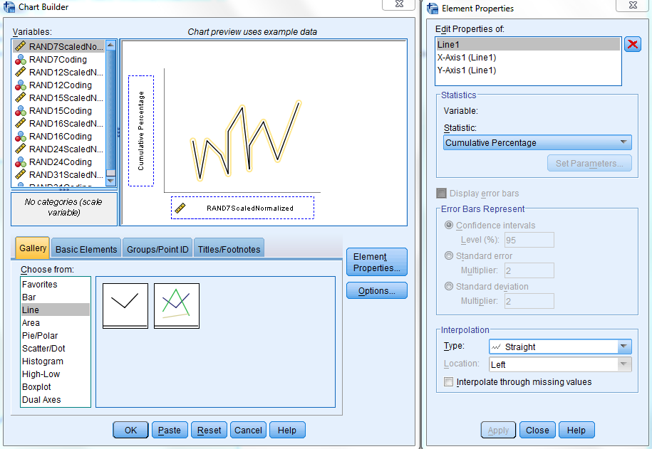 Next, to generate the cumulative plot, reopen the Chart Builder. In the Gallery tab, select "Line" in the "Choose from:" box and then double click on the "Simple Line" option. Click on the "Element Properties..." button to the right of the Gallery tab if necessary to reopen the Element Properties window. Within this window, click on the "Statistic:" drop down menu and select the "Cumulative Percentage" option. Then click "Apply" at the bottom of the window. Now select the "scaled_normalize" variable from the "Variables:" box in the Chart Builder and drag it to the box labeled "X-axis?" on the right. At this point, the Chart Builder window should look similar to the sample below.