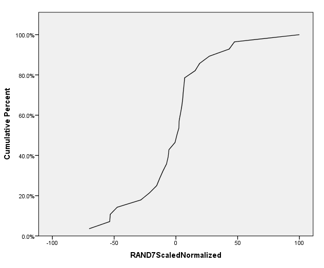 Now click "OK" at the bottom of the Chart Builder window to generate a cumulative percentage plot of the regulatory weight values within the network. A sample cumulative plot produced for the "RAND7" network is shown below.
