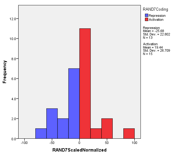 Now click "OK" at the bottom of the Chart Builder window to generated the weighted histogram. A sample weighted histogram produced for the network "RAND7", which is a random network derived from db5, is shown below.