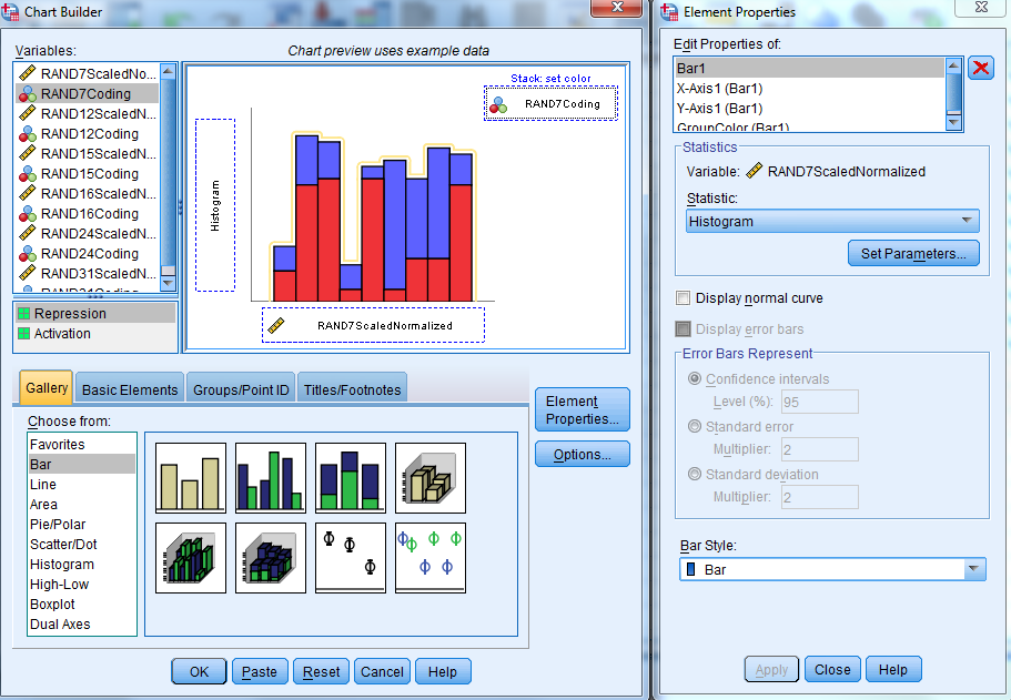 Now that the data and color coding has been properly formatted, it is time to generated the weighted histograms. To do so, click on "Graphs"-> "Chart Builder..." within the data editor. Click "OK" when presented with a popup to open the Chart Builder. In the gallery at the bottom of the window, click on "Bar" in the "Choose from..." box. Then double click on the "Stacked Bar" option to launch this format. Now click on the "Element Properties..." button to the right of the Gallery to open a second window. In the "Statistics" box, click on the drop down menu under the "Statistic:" option and select "Histogram". Next, click on the "Set Parameters..." option under the Histogram statistic designation. This will open a new window. In the "Bin Sizes" box, click on "Custom". Under "Custom", select "Interval width:" and enter the number "20" in the box to the right. This will fix the width of each bin to 20, which will fix the total number of bins to 10 given our -100 to 100 scale of weight values. Click "Continue" at the bottom of the "Element Properties: Set Parameters:" window. Finally, click "Apply" at the bottom of the "Element Properties" window. In the "Variables:" box in the upper left hand corner of the Chart Builder window, select the variable labeled "scaled_normalized". Then drag this variable into the box on the right labeled "X-Axis?". Now click on the variable labeled "coding" and drag it into the box on the right labeled "Stack: set color". Once this has been done, the Chart Builder window should look similar to the sample provided below.