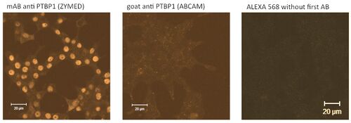 Antibody labelling of the same batch of INS1 cell line with the Everest goat antibody (middle) showed no specific staining beyond the unspecific fluorescence also observed in the no primary antibody control (right). Another antibody for PTBP1 from Zymed now sold by Invitrogen shows the typical nuclear labelling of PTBP1 in this cell line. - JS