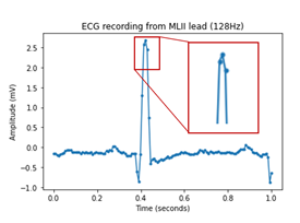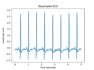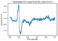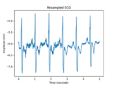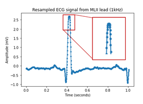 We obtain the original sampling frequency of the data from the .csv file and resample the waveform to 1000Hz, so that it is consistent over different inputs, (see https://github.com/cay15/hrv/blob/master/upsample_ecg.py). This also splits the signal so a smaller, more manageable chunk is passed to the other modules. The ECG dataset which was used to produce these plots is the MIT-BIH Normal Sinus Rhythm Sample No.16265 [1][2].