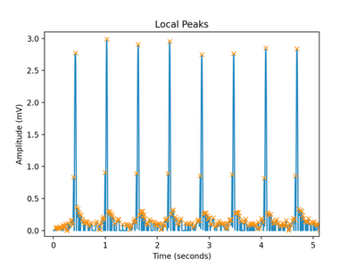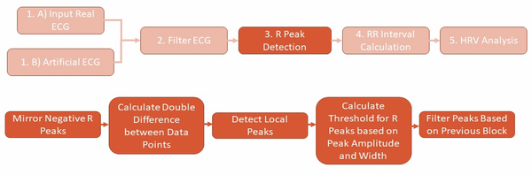 - Peak detection module which finds peaks based on whether surrounding samples have greater amplitudes than it, mirrors these peaks, for the case where peaks are inverted from medical conditions or lead placement. It then uses boundaries which can be specified to rule out peaks that are too close together by specifying a minimum amplitude, https://github.com/cay15/hrv/blob/master/peak_detection.py.