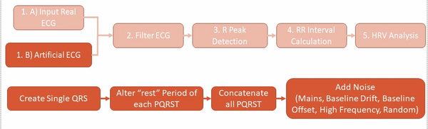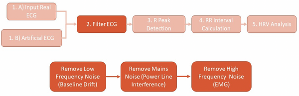 In order to create an algorithm that is able to accurately extract HRV and use it in a way which is useful to a clinician, the signal processing is broken down into the following steps: