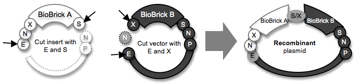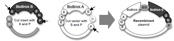 The BioBrick itself must not contain any of the standard restriction sites (internally), or else it will be cut apart during the assembly process. Basic BioBrick assembly uses one of the two strategies: