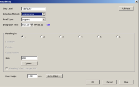 The current recommended program for reading luciferase activity on the Synergy H1 reader is: