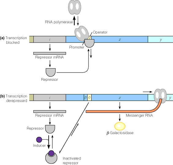 - How does the sugar induce? The hypothesis of Jacob and Monod states that the sugar , or an analog of the sugar, would prevent the attachment of the repressor to the operator, and so leave the genes open to function. The inducer might bind to the repressor in order to make it physically unable to interact with the operator. The sugar lactose itself is not an inducer. The sugar must be acted upon by beta-galactosidase, which as a transgalatoside transfers the galactose to some receptor to make the inducer. Thus the basal level of beta-galactosidase is needed to provide the first molecules of inducer. The permease must be functional to keep a high enough level of lactose in the cell for the induction by the sugar to be maintained. pp 96-97