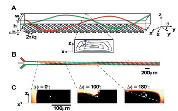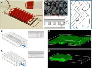 To increase the efficiency of herringbone mixers, chaotic flow can be introduced by adding both rotational and extensional local flows sequentially.[4] To achieve this, the ridges can be placed as a function of the axial length of the microfluidic chip with alternating orientation as shown in Figure 2.