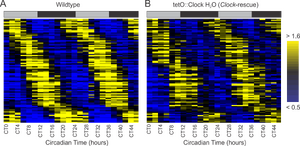 In collaboration with the Takahashi laboratory, we profiled transcriptional rhythms in mice with and without a defective circadian clock in the liver. Although most rhythmic genes are lost due to the ablation of the local circadian oscillator, nearly 100 genes continue to cycle with appropriate period lengths and phases (Figure 6). Consequently, these persistent rhythms may form the molecular basis by which the central clock drives peripheral oscillations. Strikingly, many core clock genes continue to oscillate in the absence of a local clock, implying that the promoters of these genes have evolved to be directly responsive to circulating, systemic cues from the central nervous system.