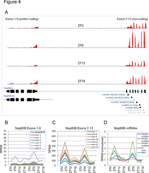 Since snoRNAs are involved in ribosomal maturation, this observation raises the possibility that these daily oscillations directly influence the assembly and stability of the ribosome, one of the most fundamental processes of cell biology. Alternatively, these snoRNAs may exert their influence over mRNAs instead, thereby regulating the stability or translation of circadian target genes. Consistent with this possibility, we found that snoRNAs can target several known clock genes in the fly, such as Takeout (to).