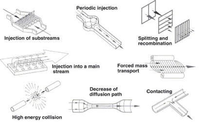 In microsystems energy can be applied to fluids to induce mixing using two major methods. Active mixing makes use of external energy input to create vibrations within the system. Energy sources used for this are ultrasound, magneto-hydrodynamic action, piezoelectric vibrating membranes, acoustic vibrations, and electro kinetic instabilities. Mixing can also be induced by methods of passive mixing, which uses energy from pumping and hydrostatic potential to modify aspects of fluid flow along channels to stretch streamlines and improve mixing. At the microscale turbulence is uncommon and flow after junctions often consists of separate lamellae. For this reason, considerations for mixing strategies are important. Complex flow patterns may be used to achieve complete mixing however it becomes difficult to model the fluid flows. For cases where the exact position and duration of mixing are of interest, it is desirable to achieve mixing without interfering with laminar flow since it can be modeled with high precision. This can be achieved with hydrodynamic focusing [2].