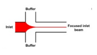 Hydrodynamic focusing is a way of controlling continuous flow mixing by confining streams to small geometries where mixing is dominated by diffusion. The major advantage of this mixing strategy is the achievement of very short complete mixing times while maintaining a highly controllable system which can be precisely modeled. In addition to knowing the distance and duration of mixing, the distance post mixing is proportional to time since the mixing point. In this system, there are three inlet streams: one central stream to be focused and two streams that converge perpendicularly to the central stream. This will cause the width of the central channel to decrease, increase the surface area and decrease the distance needed to travel for diffusion [4]. Figure 2 shows the principal of hydrodynamic focusing. This page covers hydrodynamic focusing in terms of passive mixing but it can also be used for flow cytometry and cell sorting, sensors and separation.