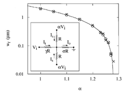 Figure 3. Electronic schematic representation of the Knight et al. device. Graph of focused stream width (Wf) vs. ratio of inlet pressures (α). Line on graph analytically determined by equation in text. Experimental data points plotted on graph.