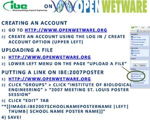 Welcome to the 2007 Meeting Student Poster Page. If you do not have an account please create one by clicking on the log in/create account button in the top right of your browser. Once you do have an account please upload your poster by using the upload file link on the lower left menu of this page(under toolbox), and place a link on this page. Several different formats can be used to upload your poster file. The poster can be uploaded as a powerpoint, but this file cannot be viewed inside the internet browser window. By saving your poster as a jpeg, your file can be previewed as in the example below. The suggested poster name for the uploaded file is: IBE2007Meeting'SchoolName''PosterName'.jpg.
