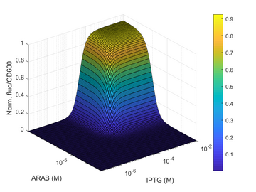 Modelled transfer function describing biological AND gate for differing inducer concentrations