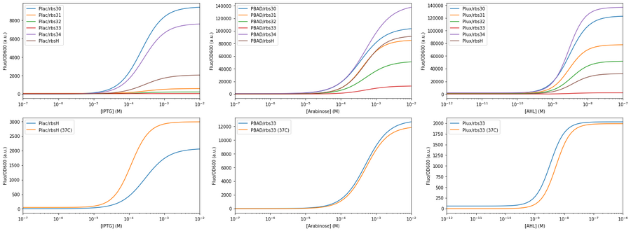 We replicated the best fits of the characterised promoter responses, using different RBSs, from the parameters described by Wang et al. in Engineering modular and orthogonal genetic logic gates for robust digital-like synthetic biology, 2011.