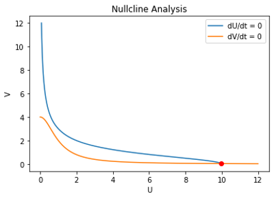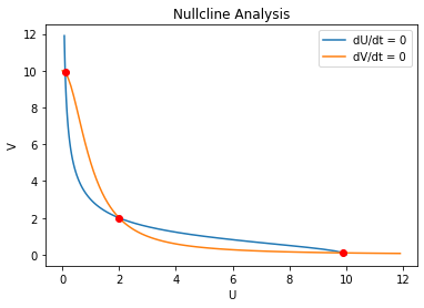 Therefore to understand the behaviour of the model we can plot the Nullclines- the curves corresponding to each of above derivatives being equal to 0. Where each of these lines intersect we get the steady state points, as the change of concentrations with respect to time for each protein here is 0.