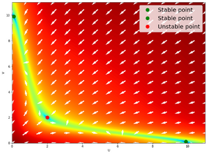 This diagram gives the vector fields for different initial concentrations of U and a V. A red colour means higher flow magnitude and the system returns to steady state faster whilst blue is smaller flow magnitudes. When concentrations are further away from steady state the system returns faster to a possible steady state and conversely for concentrations closer to the steady points the system takes longer to reach the steady state.