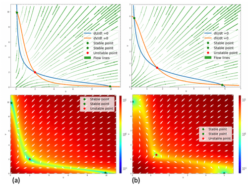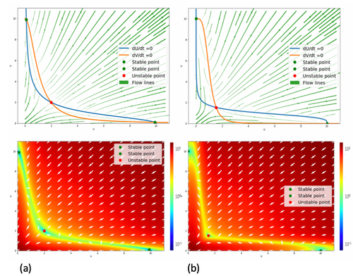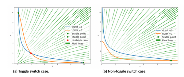 (a) shows the flow with parameters that lead to bistability and define a toggle switch. Symmetry in the parameters leads to symmetrical flow. This diagrams allows identification of the basin of attractions of each of the fixed points.
