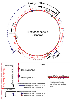 Schematic representation of the genome of the bacteriophage lambda. Q alters RNA polymerase and allows transcription of genes coding for heads and tails production.changes brought on by the Q protein