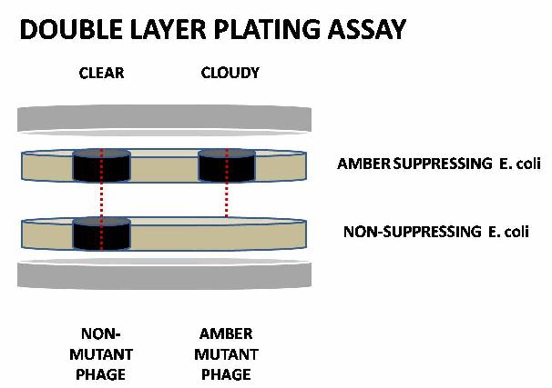 In our particular application, we are introducing amber stop codons in frame to N and Q. To screen for these mutations, phages are plated for plaques in an amber suppressor strain (E. coli LE392, supF). A further layer of non-amber suppressing cells (E. coli MG1655), without phages, is immediately plated on top of the amber suppressing layer. Phages without the amber mutation will make plaques that 'punch through' both layers, while amber mutant phages will be unable to penetrate the upper layer. The two types of plaques can be distinguished by eye, allowing us to screen for amber mutants.