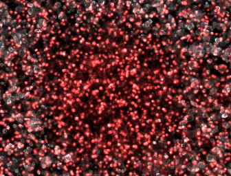 We therefore attempted a slight modification, labeling the non-suppressing bacterial with a high copy plasmid driving an RFP. This process did indeed make the two plaque types more distinguishable with the aid of a fluorescence dissecting scope. Microscopy results confirm that the two plaque types do indeed correspond to different degrees of lysis in the two layers. Below on the left is an obligate lytic mutant (cI60), which creates plaques in both unlabeled suppressor (white) and RFP labeled non-suppressor cells (red). Below on the right is an N-amber mutant phage creating a plaque in the unlabeled suppressor cells, while leaving the RFP labeled non-suppressor cells intact.