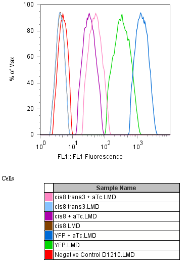 Again, cis repression is relatively tight (cis4 repression even with aTc is less than 2% of maximum fluorescence, and without aTc is indistinguishable from background). Trans activation is not as high, however, being slightly less than one-sixth the value of YFP no-aTc, or about 3 to 4% activation, and not a significant increase over the 2% fluorescence level of the cis4 repressor.