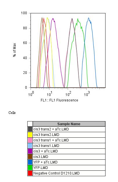 The repressions and activation levels of viral protein was tested by replacing the viral protein gene with the reported molecule YFP, with fluorescence now an indicator of host cell protein concentration. Cells were prepared according to the flow cytometry protocol, and YFP fluorescence was measured with Quanta, with results below.