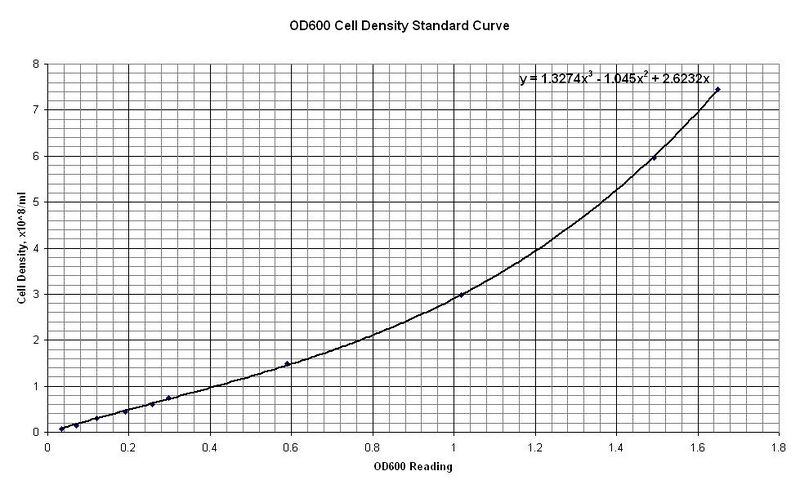 - An LB culture of TOP10 cells was serially diluted and the OD600 reading was taken for each. (UV/Vis Spectrophotometer zeroed using LB.)