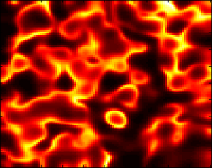 Modelling Reaction-Diffusion SystemsMathematically, reaction-diffusion systems are coupled nonlinear differential equations that can be solved numerically. Our first step will be to implement/model a simple two-component system originally proposed by Turing. After validating our numerical method and computating our first patterns (img to the right), we will be thinking about a more realistic system describing the behaviour of the activator and inhibitor system that we intend to engineer with B.subtilis. This will include an analysis of enzyme kinetics and we hope to deduce the parameter ranges, in which our B.subtilis construct will be able to form patterns, thus feeding back into our design decisions (promoter strength, rbs choice etc.). We will also take an investigative approach and ask whether Turing-like patterns can originate from a system that is simpler than the one envisioned, consisting of fewer components, e.g. depending on a single signalling molecule only. IntroductionHow does pattern formation occur? Turing considered diffusion to be the crucial component. He showed that pattern formation occurs of the system has a stable steady state in the absence of diffusion, but allows unstable states to develop when the diffusion term is added. This results in divergence (or, in a biological context, gene expression/cell differentiation) and subsequent pattern formation. In the following sections, we shall deduce conditions for pattern formation for this simple system. We will work with a two-component system and we non-dimensionalise the variables. The resulting general form is: