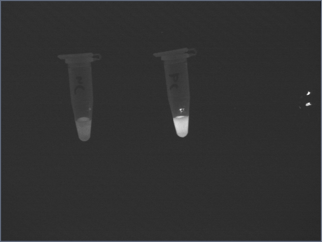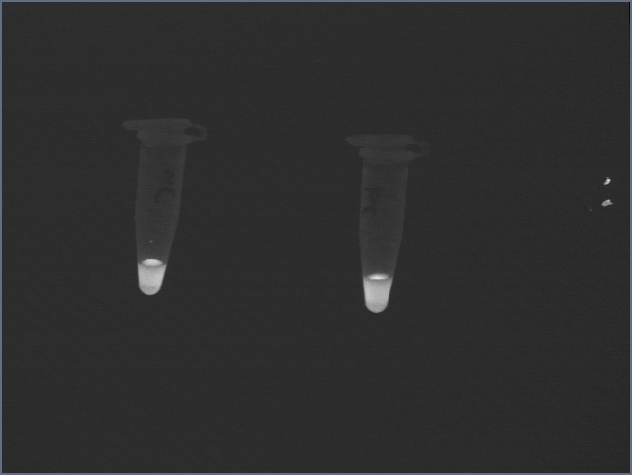 Incubate 15 min at room temp. Spin in microfuge 15000 rcf 1 min. Remove the rest of the supernatant carefully, discard. Resuspend pellet in 100 uL 0.1M HEPES pH 7.5. Record fluorescence of the pellets on UV box using digital camera (same setup used to take pictures of ethidium bromide stained gels).