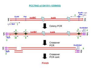 Basically, the information on this page is for designing the primers used to Colony PCR out the kaiABC construct from the PCC7942 strain, and the primers used for site-directed mutagenesis and Crossover PCR. The site-directed mutagenesis is used to remove the 1 EcoRI sites and the 2 PstI sites that interfere with BioBrick construction.