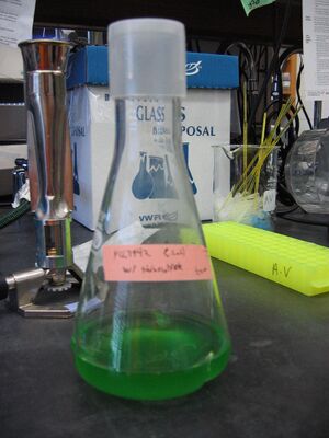 Both flasks from Friday showed growth. The flask with thiosulfate was rich green while the flask without was paler. We were surprised and pleased to find that our cyanobacteria was growing so quickly.