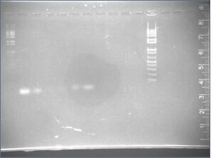 In a separate attempt to reduce smearing, Peng reran some of the products from yesterday's mutagenesis PCR on a thicker gel for a longer time (1.5% agarose, 2 hours). Image to the right. The results look the same as yesterday's, although there are two noticable differences.