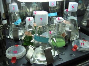 Two of our PCC 6803 flasks from 2006-6-22 have now turned deep green. A third flask is pale green. Unfortunately our PCC 6803 cultures from 2006-6-26 still aren't growing. Maybe the thiosulfate in the medium is a problem?